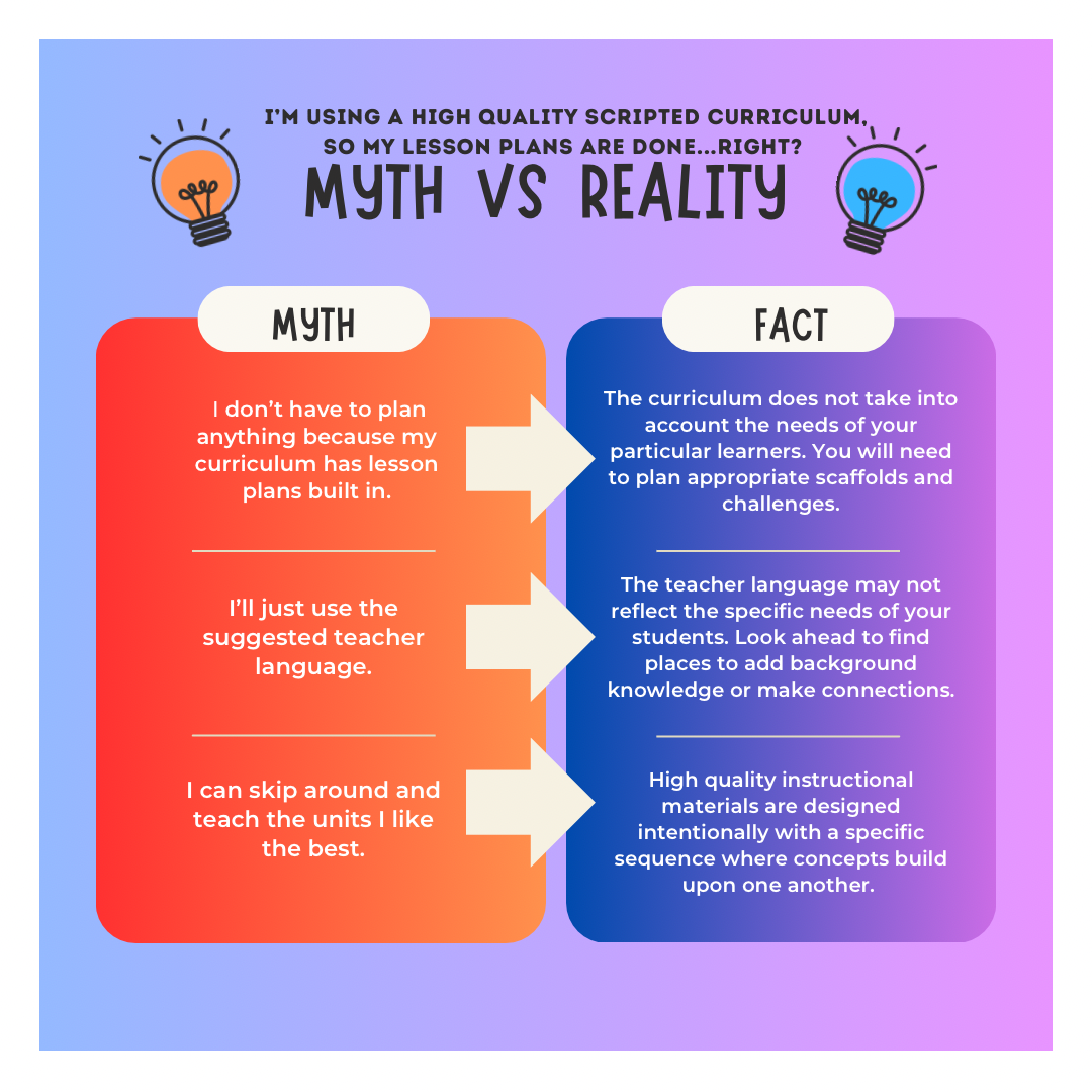 By design, HQIMs are intentionally sequenced and often include language within the lesson plans that is meant to guide teachers in delivering explicit instruction. For many folks, this is a boon, especially coming from programs that contain “basal bloat,” where teachers were left to make instructional decisions without much guidance. Unfortunately, this explicit teacher language leads to a troublesome common trend, which I call the lesson plan myth.